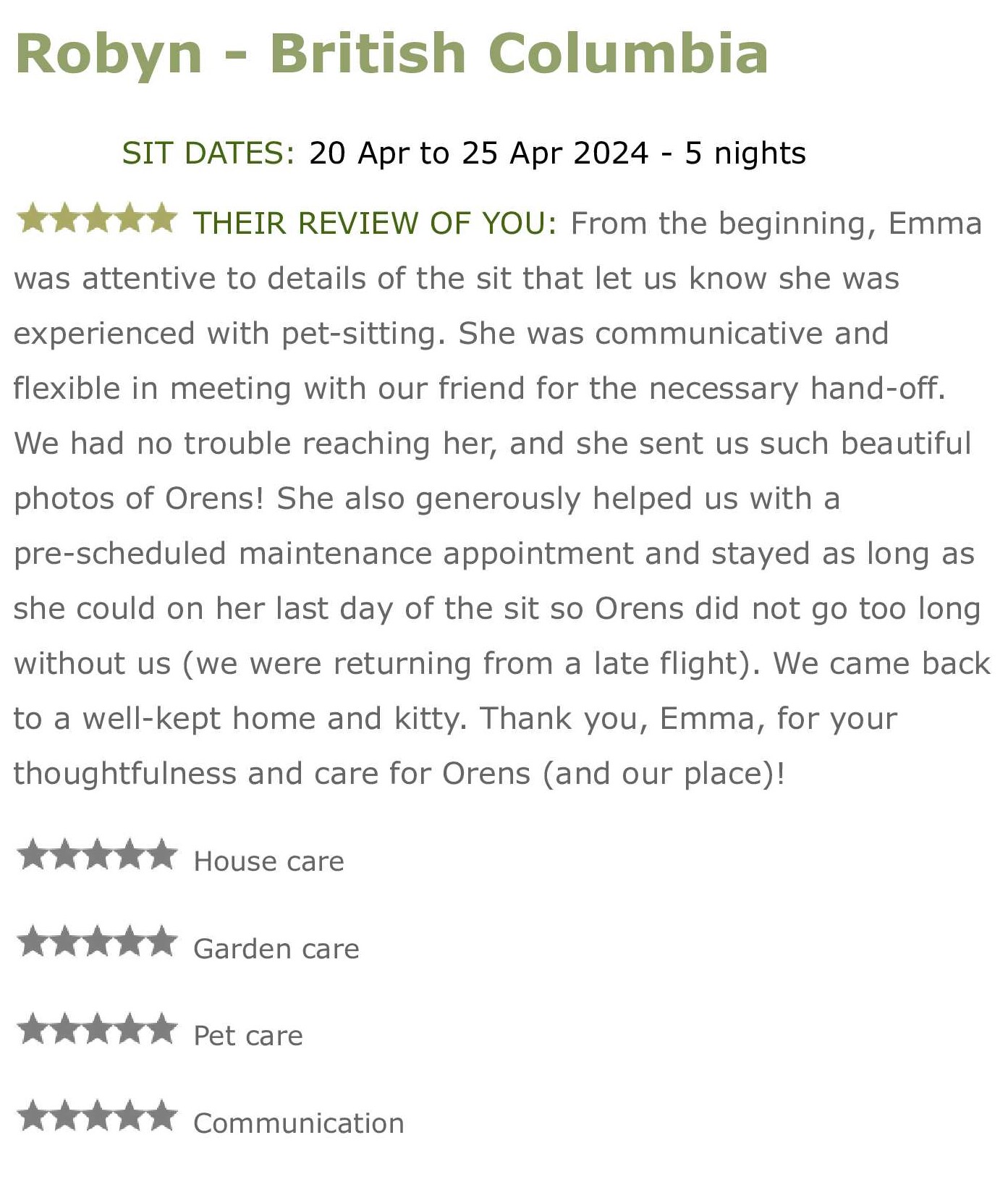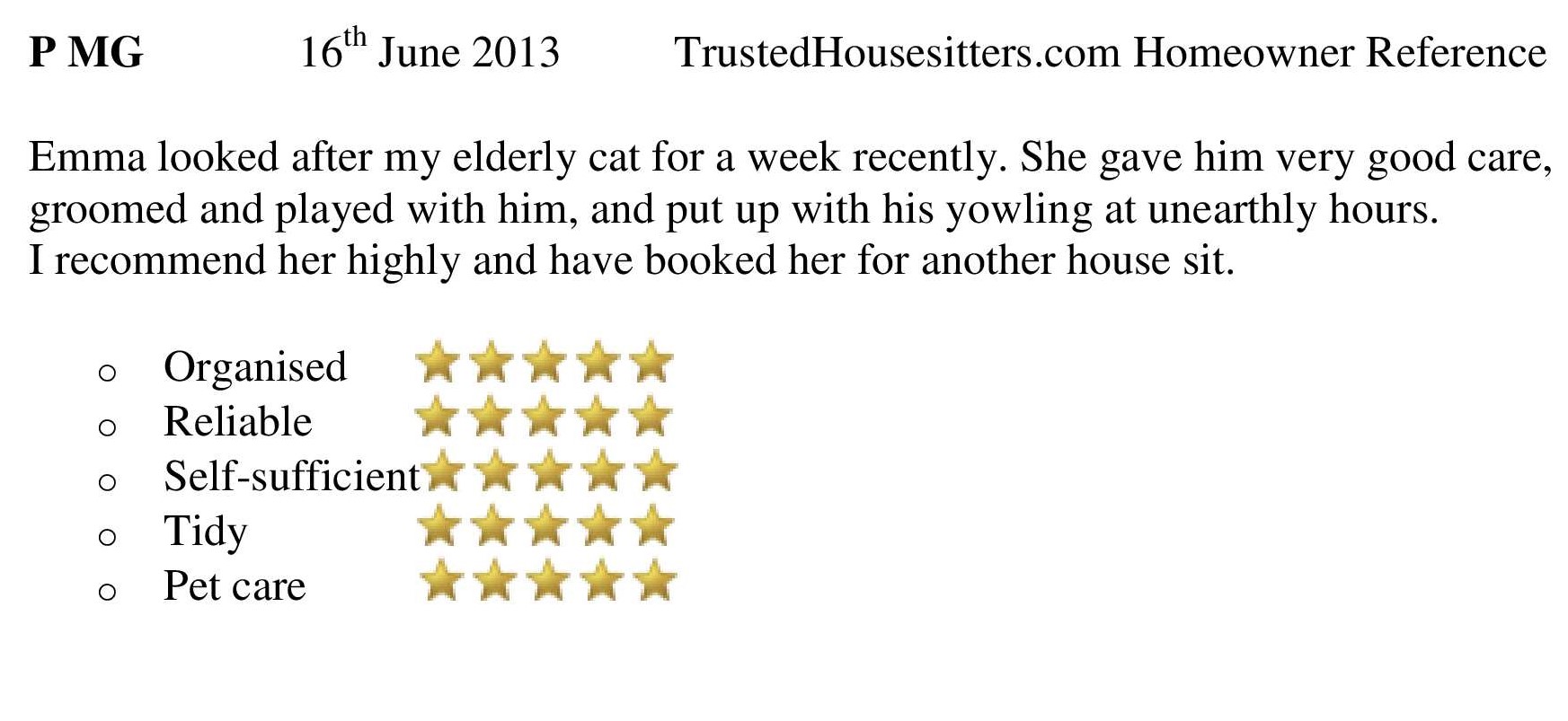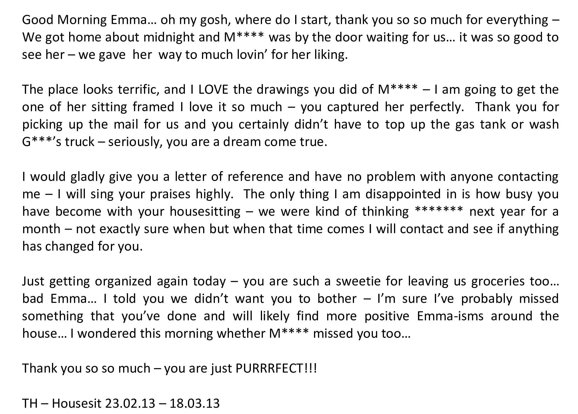 Emma looked after our house and dog superbly while we travelled for two weeks. Rosie our geriatric chihuahua was no doubt a bit of a challenge (due to her constant peeing in the house) but it was clear Emma looked after her well. When we came home Rosie was in good health and seemed well adjusted. Much better than when she had to leave home for a kennel! Our house was also in perfect shape, even better than we left it two weeks earlier. Emma is a responsible and conscientious person. She does great work. It was so good to be able to relax and not worry when I was away. Thanks, Emma!